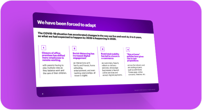 We have been forced to adapt The COVID-19 situation has accelerated changes in the way we live and work by 3 to 5 years, so what we had expected to happen by 2025 is happening in 2020. 1 2 3 4 Closure of office Social distancing has Restricted mobility “Stay at home” premises has shifted increased digital has led to a boom in policies have given many employees to engagement e-commerce rise to new remote working, propositions as interactions with as customers, heavily with parents having to family and friends, home reliant on delivery across the industry and play multiple roles as schooling, services, encourage are scaling at pace, they balance work and entertainment, and even businesses to launch such as with home the care of their children. banking relationships, all online services and fitness apps, online move to digital. accept digital payments. concerts, theatres, etc. 4