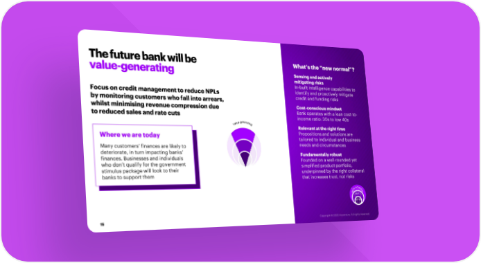 The future bank will be What’s the “new normal”? value-generating Sensing and actively mitigating risks In-built intelligence capabilities to Focus on credit management to reduce NPLs identify and proactively mitigate by monitoring customers who fall into arrears, credit and funding risks whilst minimising revenue compression due Cost-conscious mindset to reduced sales and rate cuts Bank operates with a lean cost-to- income ratio: 30s to low 40s Relevant at the right time Where we are today Propositions and solutions are tailored to individual and business Many customers’ finances are likely to needs and circumstances deteriorate, in turn impacting banks’ NEW Fundamentally robust finances. Businesses and individuals Founded on a well-rounded yet who don’t qualify for the government simplified product portfolio, stimulus packagewill look to their underpinned by the right collateral banks to support them that increases trust, not risks NEW 15