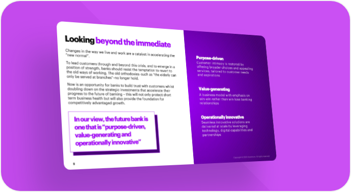 Looking beyond the immediate Changes in the way we live and work are a catalyst in accelerating the Purpose-driven ”new normal”. Customer intimacy is restored by To lead customers through and beyond this crisis, and to emerge in a offering broader choices and appealing position of strength, banks should resist the temptation to revert to services, tailored to customer needs the old ways of working. The old orthodoxies–such as “the elderly can and aspirations only be served at branches”–no longer hold. Now is an opportunity for banks to build trust with customers whilst Value-generating doubling down on the strategic investments that accelerate their progress to the future of banking – this will not only protect short A business model with emphasis on term business health but will also provide the foundation for win-win rather than win-lose banking competitively advantaged growth. relationships In our view, the future bank is Operationally innovative Seamless innovative solutions are one that is “purpose-driven, delivered at scale by leveraging value-generating and technology, digital capabilities and partnerships operationally innovative” 5