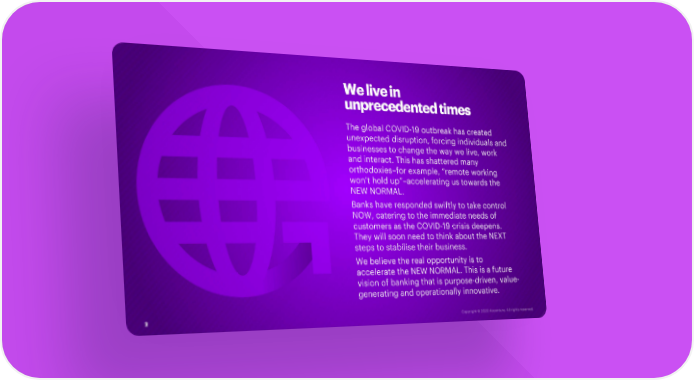 We live in unprecedented times The global COVID-19 outbreak has created unexpected disruption, forcing individuals and businesses to change the way we live, work and interact. This has shattered many orthodoxies–for example, “remote working won’t hold up”–accelerating us towards the NEW NORMAL. Banks have responded swiftly to take control NOW, catering to the immediate needs of customers as the COVID-19 crisis deepens. They will soon need to think about the NEXT steps to stabilise their business. We believe the real opportunity is to accelerate the NEW NORMAL. This is a future vision of banking that is purpose-driven, value- generating and operationally innovative. 2