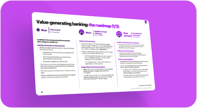 Value-generating banking: the roadmap (1/2) New Now Take control Next Stabilise through New Accelerate the 1–2 months New efficiency future bank 3–6 months New normal 6+ months In addition to the measures banks have already Enhance risk monitoring Continue relief measures for customers taken, things to consider are: • Ring-fence higher-risk COVID-19-related loans–deploy • Closely monitor customers who have taken out credit Identify and monitor at-risk customers different systems, monitoring and reporting and develop a during the COVID-19 period and support them with separate credit model for loans impacted by COVID-19, appropriate treatment strategies • Identify and adapt treatment plans for customers who are financially at risk, e.g.: e.g. “zombie” businesses, or mortgage defaults Enhance cost consciousness • Employees who did not receive a pay cheque in the • Enhance credit watchlist, increase the frequency of credit • Create a cost-conscious culture and establish current month reviews to enable early intervention, by: governance, policies and measures to optimise spend; • Identifying trends in consumer transaction activity / reinvest savings to scale the business • Self-employed individuals who cannot access account balances to predict individual or SME government funding until June customers in financial difficulty Scale up new propositions • Businesses ineligible for COVID-19 relief • Uncovering potential hidden risks in SMEs using • Re-evaluate the customer segmentation model and adopt • Continue to monitor early warning signals and offer new personal accounts for business a persona-led approach to proposition design short-term loans, e.g. unsecured lending, transactional Suggest alternative financing options • Launch new propositions aimed at supporting customer and working capital loans growth, tailored to different segments: • Work with customers to restructure or refinance existing • Adapt credit policies to allow customers to lend against • A savings product to help consumers re-start wealth loans alternative underlying assets where cash flow is accumulation, e.g. low-risk funds integrating with constrained wealth managers such as Wealthify • Review credit policies to ensure credit decisions made to • Consider directing customers to alternative lenders with • Give SMEs access to new supplier finance /working support customers comply with regulations different eligibility criteria, e.g. recommend to digital capital products to help scale-up production banks such as OakNorth, Tide, Starling, etc. Continued on next slide 16