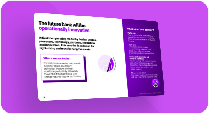 The future bank will be What’s the “new normal”? operationally innovative Digital first Majority of processes, interactions and transactions are performed completely online with reduced reliance on physical Adjust the operating model by flexing people, footprint processes, technology, partners, regulation Truly open and innovation. This sets the foundation for Connections across multiple right-sizing and transforming the estate ecosystems to broaden front-end distribution, enhance customer propositions and optimise capabilities Radical shift to mobiliseand Where we are today virtualise workforce Flexible working with the ability to stay Physical processes delay responses to connected, while deploying smart customer crises, and legacy technology and practices that augment technology impedes optimal NEW human activity and enable a multi- workforce productivity. Ultimately, skilled workforce these inhibit the operational step- Always on and secure change required to grow profitability Operational resilience to protect assets and, more importantly, customer data NEW 18