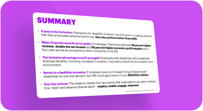 SUMMARY • It pays to be inclusive: Champions for disability inclusion not only excel in creating cultures that help employees advance and thrive, they also perform better financially. • Major financial rewards up for grabs:On average, Champions achieved 28 percent higher revenue, double the net income and 30 percent higher economic profit margins over a four-year period as compared to other companies in the DEI. • The inclusion advantage is multi-pronged:Employees with disabilities offer substantial business benefits, including increased innovation, improved productivity and a better work environment. • Secret to a healthier economy:If employers were to increase hiring of persons with disabilities by just one percent, the GDP could get a boost of up to$25 billion dollars. • Four key actions: The research reveals four key actions that organizations can take to attract, hire, retain and advance diverse talent – employ, enable, engage, empower. Copyright © 2018 Accenture. All rights reserved. 18
