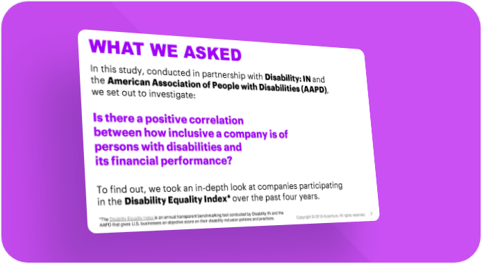 WHAT WE ASKED In this study, conducted in partnership with Disability: IN and the American Association of People with Disabilities (AAPD), we set out to investigate: Is there a positive correlation between how inclusive a company is of persons with disabilities and its financial performance? To find out, we took an in-depth look at companies participating in the Disability Equality Index* over the past four years. *The Disability Equality Index is an annual transparent benchmarking tool conducted by Disability:IN and the AAPD that gives U.S. businesses an objective score on their disability inclusion policies and practices. Copyright © 2018 Accenture. All rights reserved. 2