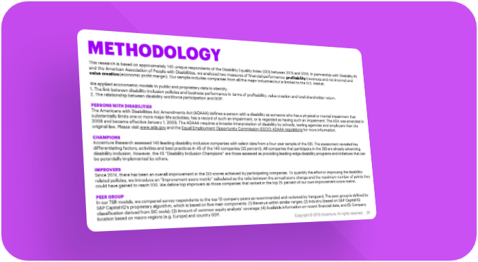 METHODOLOGY This research is based on approximately 140 unique respondents of the Disability Equality Index (DEI) between 2015 and 2018. In partnership with Disability:IN and the American Association of People with Disabilities, we analyzed two measures of financial performance: profitability (revenues and net income) and value creation (economic profit margin). Our sample includes companies from all the major industries but is limited to the U.S. market. We applied econometric models to public and proprietary data to identify: 1. The link between disability inclusion policies and business performance in terms of profitability, value creation and total shareholder return. 2. The relationship between disability workforce participation and GDP. PERSONS WITH DISABILITIES The Americans with Disabilities Act Amendments Act (ADAAA) defines a person with a disability as someone who has a physical or mental impairment that substantially limits one or more major life activities; has a record of such an impairment; or is regarded as having such an impairment. The ADA was amended in 2008 and became effective January 1, 2009. The ADAAA requires a broader interpretation of disability by schools, testing agencies and employers than the original law. Please visit www.ada.gov and the Equal Employment Opportunity Commission (EEOC) ADAAA regulations for more information. CHAMPIONS Accenture Research assessed 140 leading disability-inclusive companies with select data from a four-year sample of the DEI. The assessment revealed key differentiating factors, activities and best practices in 45 of the 140 companies (32 percent). All companies that participate in the DEI are already advancing disability inclusion. However, the 45 “Disability Inclusion Champions” are those assessed as providing leading-edge disability programs and initiatives that can be potentially implemented by others. IMPROVERS Since 2014, there has been an overall improvement in the DEI scores achieved by participating companies. To quantify the effort in improving the disability- related policies, we introduce an “improvement score metric” calculated as the ratio between the annual score change and the maximum number of points they could have gained to reach 100. We define top improvers as those companies that ranked in the top 25 percent of our own improvement score metric. PEER GROUP In our TSR models, we compared survey respondents to the top 10 company peers as recommended and reviewed by Vanguard. The peer group is defined by S&P Capital IQ’s proprietary algorithm, which is based on five main components: (1) Revenue within similar ranges; (2) Industry (based on S&P Capital IQ classification derived from SIC code); (3) Amount of common equity analysts’ coverage; (4) Available information on recent financial data; and (5) Company location based on macro-regions (e.g. Europe) and country GDP. Copyright © 2018 Accenture. All rights reserved. 20