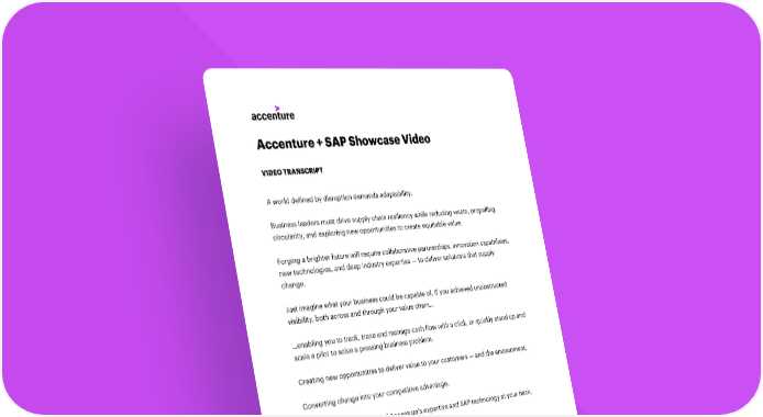 Accenture + SAP Showcase Video VIDEO TRANSCRIPT A world defined by disruption demands adaptability. Business leaders must drive supply chain resiliency while reducing waste, propelling circularity, and exploring new opportunities to create equitable value. Forging a brighter future will require collaborative partnerships, innovation capabilities, new technologies, and deep industry expertise — to deliver solutions that supply change. Just imagine what your business could be capable of, if you achieved unobstructed visibility, both across and through your value chain… …enabling you to track, trace and manage cash flow with a click, or quickly stand up and scale a pilot to solve a pressing business problem. Creating new opportunities to deliver value to your customers — and the environment. Converting change into your competitive advantage. With the combined power of Accenture’s expertise and SAP technology at your back, you can… Supply change to your business. Supply change to your industry. Supply change to the world. Explore our showcase and discover how we can supply change — together. Copyright © 2022 Accenture All rights reserved. Accenture and its logo are registered trademarks of Accenture.