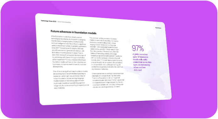 Technology Vision 2023 | When Atoms meet Bits #T#TechVechVisionision Future advances in foundation models While foundation models have already pushed This can mean building standalone foundation technological boundaries, it’s important to recognize models for new kinds of data. Meta, for instance, that the 昀椀eld is changing quickly. Stanford’s 2022 developed a protein-folding model—a large Arti昀椀cial Intelligence Index Report found a signi昀椀cant language model that learned the “language uptick in the annual number of global AI publications of protein”—that accelerated protein structure 187 190 since 2017. According to CB Insights, 2022 saw predictions by up to 60x. And a research team 97% record investments in generative AI startups, with from the University of Texas at Austin, the Indian 188 $2.6 billion in funding across 110 deals. And in Institute of Technology Madras, and Google of global executives early 2023, Microsoft announced the next phase of Research, proposed Generalizable NeRF Transformer agree AI foundation its partnership with OpenAI through a multibillion (GNT), a transformer-based architecture for NeRF models will enable 189 191, 192 dollar investment. To truly understand the impact reconstruction. A NeRF (Neural Radiance Field) is connections across data foundation models will have on their industries and a neural network that can generate 3D scenes based businesses, companies need to carefully track new on only partial 2D views—and experimenting with pes, revolutionizing developments. transformers to generate 3D data like this could have where and how big metaverse implications. AI is used. One of the most signi昀椀cant ways foundation models are evolving has to do with the data types they’re Other organizations are working to incorporate more trained on—which right now are limited. Most of data types into a single model. Take Microsoft’s today’s foundation models are large language Florence, a foundation model built for general- 193 models trained on natural language, and even purpose computer vision tasks. While it was trained multimodal models are typically language-and- on a large data set of image-text pairs and has only image only. But some are working to expand to more a two-tower architecture, combining one language data modalities. encoder and one image encoder, its creators