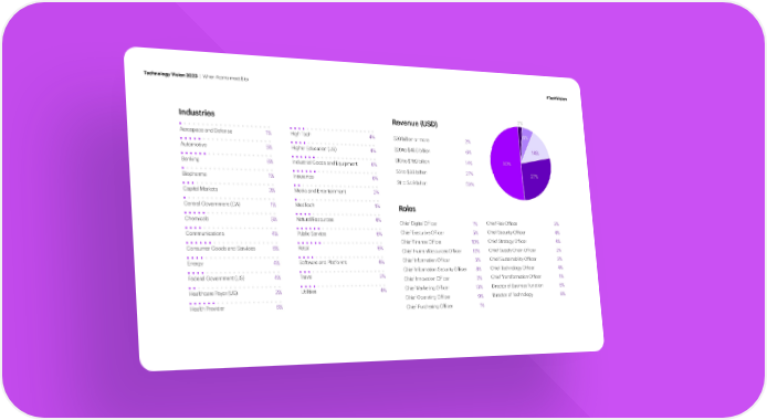 Technology Vision 2023 | When Atoms meet Bits #TechVision Industries Revenue (USD) 2% 6% Aerospace and Defense 1% High Tech 4% $50 billion or more 2% Automotive 5% Higher Education (US) 4% $20 to $49.9 billion 6% 14% $10 to $19.9 billion 14% 50% Banking 6% Industrial Goods and Equipment 6% $5 to $9.9 billion 27% 27% Biopharma 1% Insurance 6% $1 to $4.9 billion 50% Capital Markets 3% Media and Entertainment 2% Central Government (CA) 1% MedTech 1% Roles Chemicals 5% Natural Resources 4% Chief Digital Of昀椀cer 1% Chief Risk Of昀椀cer 2% Communications 4% Public Service 6% Chief Executive Of昀椀cer 5% Chief Security Of昀椀cer 4% Chief Finance Of昀椀cer 10% Chief Strategy Of昀椀cer 4% Consumer Goods and Services 6% Retail 6% Chief Human Resources Of昀椀cer 12% Chief Supply Chain Of昀椀cer 2% Energy 4% Software and Platforms 4% Chief Information Of昀椀cer 5% Chief Sustainability Of昀椀cer 2% Chief Information Security Of昀椀cer 8% Chief Technology Of昀椀cer 4% Federal Government (US) 4% Travel 3% Chief Innovation Of昀椀cer 2% Chief Transformation Of昀椀cer 1% Healthcare Payor (US) 2% Utilities 4% Chief Marketing Of昀椀cer 13% Director of Business Function 6% Chief Operating Of昀椀cer 9% Director of Technology 8% Health Provider 6% Chief Purchasing Of昀椀cer 1%