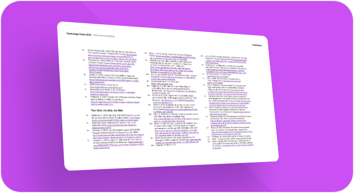 Technology Vision 2023 | When Atoms meet Bits #TechVision 88. Garner Researchers. (2022, May 31). Gartner Identi昀椀es Top 98. Press, G. (2013, May 9). A Very Short History Of Big Data. 109. Luca, M. (2016). Reviews, Reputation, and Revenue: The Case Five Trends in Privacy Through 2024. Gartner: https://www. Forbes: https://www.forbes.com/sites/gilpress/2013/05/09/a- of Yelp.com. Harvard Business School: https://www.hbs.edu/ gartner.com/en/newsroom/press-releases/2022-05-31- very-short-history-of-big-data/?sh=1743b36665a1 ris/Publication%20Files/12-016_a7e4a5a2-03f9-490d-b093- gartner-identi昀椀es-top-昀椀ve-trends-in-privacy-through-2024 99. Glassdoor.com launches public beta, opening doors to 8f951238dba2.pdf 89. Preparing for a World Without Third-party Cookies. (2020, employee salaries, bonuses, reviews and ratings at any 110. Anderson, M., and Magruder, J. (2013). Does Yelp Affect October). Epsilon: https://www.epsilon.com/hubfs/3PC_ company for free. (2008, June 11). Glassdoor: Restaurant Demand? Agricultural and Resource Economics: Deprecation_Research_Exec_Summary_23Oct2020. https://www.glassdoor.com/about-us/glassdoorcom- https://s.giannini.ucop.edu/uploads/giannini_public/9e/ pdf?hsCtaTracking=6eda0e9d-6c8d-4c52-922f- launches-public-beta-opening-doors-employee-salaries- fe/9efe6100-005c-4b7c-aaa8-678a96a883cb/v16n5_1.pdf 1e396ac75978%7C8c887de0-50d4-40c9-9ebe- bonuses-reviews-ratings-company-free/ 111. In昀椀nite horizons. (n.d.). Cirium.com: 93d1c26e8d29 100. Armstrong, M. (2019, April 16). Global Data Creation is About https://www.cirium.com/about/ 90. Uzialko, A. (2023, January 23). How GDPR Is Impacting to Explode. Statista: https://www.statista.com/chart/17727/ 112. Cirium. (2019, May 21). Cirium: A Smarter Way to Business and What to Expect in 2023. Business News Daily: global-data-creation-forecasts/ Travel. YouTube.com: https://www.youtube.com/ https://www.businessnewsdaily.com/15510-gdpr-in-review- 101. Open Government. (n.d.). Data.gov: watch?v=wtRZrJijNNM data-privacy.html https://data.gov/open-gov/ 113. Cirium integrates the most accurate CO emissions and 91. GDPR Enforcement Tracker (n.d.): 102. Dehghani, Z. (2019, May 20). How to Move Beyond 2 昀氀ight tracking data with its unrivalled 昀氀eets database. https://www.enforcementtracker.com/ a Monolithic Data Lake to a Distributed Data Mesh. (2022, October 18). Cirium.com: https://www.cirium. 92. Digital identity in Web3. (n.d.) J.P. Morgan: MartinFowler.com: https://martinfowler.com/articles/data- com/thoughtcloud/cirium-integrates-most-accurate-co2- https://www.jpmorgan.com/onyx/content-hub/digital- monolith-to-mesh.html emissions-and-昀氀ight-tracking-data-with-昀氀eets-database/ identity-in-web3.htm 103. La Monica, P. (2020, September 17). Snow昀氀ake shares 114. Container Rates Alert: Calm before storm, as long-term 93. Fadilpašić, S. (2022, October 27). JPMorgan Exploring Digital more than double. It’s the biggest software IPO ever. CNN ocean freight rates hold steady ahead of expected New Year Identity Wallets in Web3. Crypto News Business: https://www.cnn.com/2020/09/16/investing/ pain. (2022, December 22). Xeneta.com: https://www.xeneta. https://cryptonews.com/news/jpmorgan-exploring-digital- snow昀氀ake-ipo/index.html com/news/calm-before-storm-as-long-term-ocean-freight- identity-wallets-web3.htm 104. Taylor, P. (2022, September 8). Amount of data created, rates-hold-steady-ahead-of-expected-new-year-pain consumed, and stored 2010-2020, with forecasts to 115. ABF Uses Xeneta to Negotiate a 30% Decrease in Ocean Your data, my data, our data 2025. Statista: https://www.statista.com/statistics/871513/ Rates and Provide Category Leadership in Logistics worldwide-data-created/ Procurement. (n.d.). Xeneta.com: https://www.xeneta.com/ 94. Maldarelli, C. (2021, April 26). Why 10,000 steps a day isn’t 105. Clark, S. (2022, July 6). World’s rockets on pace for record abf-customer-case-study the secret to better health. Popular Science: https://www. year of launch activity. Space昀氀ight Now: 116. Consumer demand for food transparency remains strong as popsci.com/story/health/10000-steps-evidence-study/ https://space昀氀ightnow.com/2022/07/06/worlds-rockets-on- omnichannel rises. (2022, January 25). NielsenIQ: 95. Kelley Blue Book Celebrates 80 Years of Trust. (n.d.). pace-for-record-year-of-launch-activity/ https://nielseniq.com/global/en/news-center/2022/ Kelley Blue Book: https://mediaroom.kbb.com/press- 106. More than 680 昀椀nancial institutions with US$130+ trillion consumer-demand-for-food-transparency-remains-strong- releases?item=105784 in assets call on nearly 10,400 companies to disclose as-omnichannel-rises/ 96. Coleman, J. (2022, July 22). Landsat Legacy: NASA-USGS environmental data through CDP. (2022, March 14). CDP: 117. Adams, H. (2021, December 13). Report shows shoppers Program Observing Earth from Space Turns 50. NASA: https://www.cdp.net/en/articles/media/More-than-680- want transparency in the supply chain. SupplyChain: https://www.nasa.gov/feature/goddard/2022/landsat-legacy- 昀椀nancial-institutions-call-on-nearly-10400-companies-to- https://supplychaindigital.com/sustainability/report-shows- nasa-usgs-program-observing-earth-from-space-turns-50 disclose-environmental-data-through-CDP shoppers-want-transparency-supply-chain 97. Canavan, H. (2014, August 5). Yelp Turns 10: From Startup 107. Board Diversity Matrix Disclosure Requirments and 118. Armstrong, M. Global Data Creation is About to Explode. to Online Review Dominance. Eater.com: https://www.eater. Examples. (2023, January 26). Nasdaq: https://listingcenter. 119. Taylor, P. Amount of data created, consumed, and stored. com/2014/8/5/6177213/yelp-turns-10-from-startup-to-online- nasdaq.com/assets/Board Matrix Examples_Website.pdf 120. Hasan, M. (2022, May 18). State of IoT 2022: Number of review-dominance 108. Canavan, H. Yelp Turns 10. connected IoT devices growing 18% to 14.4 billion globally. IoT A