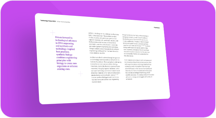 Technology Vision 2023 | When Atoms meet Bits #TechVision platform, including both its codebase and foundries Though a relatively new 昀椀eld, synthetic biology is 272 (labs), for its customers. Its codebase consists being used already. It’s well-known for aiding in Driven forward by of cells, enzymes, and genetic programs, which the development of the COVID-19 vaccine, but technological advances organism engineers can use to start projects. And it’s also used by Bolt Threads to make bio-based the foundries are its factories, which combine leather and Upside Foods to produce synthetic 275, 276, 277 in DNA sequencing automation, analytics, and software to automate meat like duck, beef, and chicken. Synthetic and synthesis and and scale organism engineering. Not surprisingly, biology techniques can also be used to make technology-inspired Ginkgo’s website draws many parallels to software dyes, cosmetics, and spices. Not only are these best practices, engineering, and its platform has been likened to new and innovative products, but they are more cloud platforms like AWS. environmentally friendly and sustainable than synthetic biology their alternatives. combines engineering Another example of synthetic biology being driven principles with by technology-inspired practices comes from the From materials and energy to Earth and space and biology to create new BioBricks Foundation. The organization is attempting bio-innovation, these three domains are just a few to establish an open-source synthetic biology early ways the science technology feedback loop organisms or enhance movement, inspired by the open-source software is already at work. And each of them has huge existing ones. movement, through programs like bionet, which potential impact on the futures of companies and is an open technology commons for scientists to industries. As more companies start to recognize share their materials in the name of collaboration, that and take advantage of technology-driven 273, 274 standardization, and sharing for science. scienti昀椀c advances, the building blocks of innovation In short, synthetic biology as we know it today will start to change, and stragglers will quickly be has clear computer science- and engineering- left behind. inspired origins.
