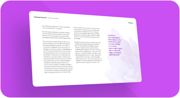 Technology Vision 2023 | When Atoms meet Bits #TechVision only increasing, bringing new innovation possibilities Knight realized the ways in which, conversely, biology —and new opportunity—to everyone. could bene昀椀t from engineering principles, like using modularization and abstraction to build biological 243 It’s a wide-ranging imperative, but already there are systems. And indeed this approach has expedited Advances in a few key domains where the science-technology the growth of synthetic biology—a 昀椀eld now poised rocket and satellite feedback loop is having great impact and where to disrupt materials and manufacturing as we know businesses can start to focus their innovation efforts. them today. technologies are also rede‹ning the space One such area is synthetic biology, and its origin is Besides the emergent 昀椀eld of synthetic biology, other economy, enabling a prime example of just how powerful the science- notable domains are also seeing major advances more science from the science-technology feedback loop. For technology feedback loop can be. Tom Knight is considered the godfather of synthetic biology, but instance, next-generation computing methods, experiments in space 242 he began as a computer scientist. While designing enabled by the combination of increased computing labs, as well as the one of the 昀椀rst silicon retinas for his PhD, he began power and new capabilities inspired by science, are study of deep space investigating Moore’s Law, or the observation that starting to unlock new scienti昀椀c possibilities in areas and Earth itself. the number of transistors on an integrated circuit like computational chemistry for new materials and doubles every two years, making compute power energy solutions. Advances in rocket and satellite grow exponentially. He saw that eventually Moore’s technologies are also rede昀椀ning the space economy, Law would come to an end—because transistors enabling more science experiments in space labs, as would be so small that placing a dozen or so well as the study of deep space and Earth itself. atoms correctly would be impossible in the silicon manufacturing process. This was what led Knight to biochemistry, because he recognized that if proteins naturally and accurately self-assemble, perhaps the right bio-molecules could too. At the same time,