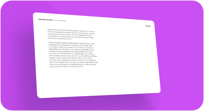 Technology Vision 2023 | When Atoms meet Bits #TechVision 30 develop a bacteria-produced bioplastic designed to decompose in the ocean. So far, 昀椀ve oceanographic equipment manufacturing partners have committed to replacing all their traditional plastic with this new degradable bioplastic once it’s ready, with commercialization and other product applications being 31 explored as the collaboration evolves. Or look at the grand challenge of delivering better healthcare. When it comes to using data to improve treatment, hospitals are typically limited to their own datasets for patient privacy reasons. But in a recent study published in Nature Medicine, 20 hospitals from around the world participated in training a federated learning model called EXAM, which predicted future oxygen 32 The model leveraged data, including requirements of COVID-19 patients. patient vital signs, laboratory data, and chest X-rays, from all of the participating hospitals—but each hospital trained their own copy of the AI model and periodically shared updates with a centralized server, which then aggregated them to train the global model. In this case, the hospitals created a shared reality that they couldn’t have before, using federated learning to safely share digital data on physical information to improve AI predictions.