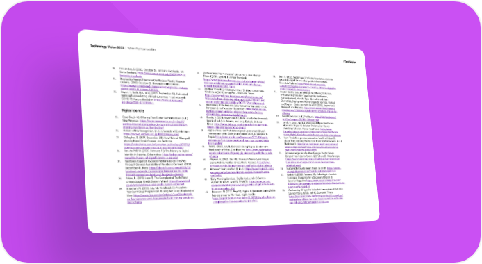 Technology Vision 2023 | When Atoms meet Bits #TechVision 30. Fernandez, S. (2022, October 5). Fantastic Bioplastic. UC 40. Aadhaar enrollment crosses 1 billion mark: Ravi Shankar 50. Burt, C. (2022, September 27). Gates Foundation commits Santa Barbara: https://www.news.ucsb.edu/2022/020733/ Prasad (2016, April 4). Business Standard: $200M to digital ID and other public infrastructure. fantastic-bioplastic https://www.business-standard.com/article/current-affairs/ Biometric Update: https://www.biometricupdate. 31. Bioplastics Made of Bacteria Can Reduce Plastic Waste in aadhaar-enrollment-crosses-1-billion-mark-ravi-shankar- com/202209/gates-foundation-commits-200m-to-digital-id- Oceans. (2022, October 6). University of Rochester: prasad-116040400863_1.html and-other-public-infrastructure https://www.rochester.edu/newscenter/bioplastics-reduce- 41. Aadhaar ID saving Indian govt about $1 billion per annum: 51. Digital Identity Solutions Market by Offering (Solutions plastic-waste-in-oceans-536322/ World Bank (2016, January 14). Economic Times: and Services), Solution Type (Identity Veri昀椀cation, 32. Dayan, I., Roth, H.R., et al. (2021, September 15). Federated https://economictimes.indiatimes.com/news/economy/ Authentication), Identity Type (Biometric and Non- learning for predicting clinical outcomes in patients with 昀椀nance/aadhaar-id-saving-indian-govt-about-1-billion-per- Biometric), Deployment Mode, Organization Size, Vertical COVID-19. Nature Medicine: https://www.nature.com/ annum-world-bank/articleshow/50575112.cms?from=mdr and Region - Global Forecast to 2027. (2022, September). articles/s41591-021-01506-3 42. The History of the General Data Protection Regulation (n.d.) Research and Markets: https://www.researchandmarkets. European Data Protection Supervisor: https://edps.europa. com/reports/5393866/digital-identity-solutions-market-by- Digital identity eu/data-protection/data-protection/legislation/history- offering general-data-protection-regulation_en 52. b.well Overview. (n.d.) Pitchbook: https://pitchbook.com/ 33. Case Study #2: Offering Two-Factor Authentication. (n.d.) 43. Steele, K. (2018, November 29). Delta unveils 昀椀rst biometric pro昀椀les/company/121691-08#overview New America: https://www.newamerica.org/in-depth/ terminal in U.S. in Atlanta; next stop: Detroit. Delta Air 53. Landi, H. (2021, April 2). Mastercard Makes Healthcare getting-internet-companies-do-right-thing/case-study-2- Lines: https://news.delta.com/delta-unveils-昀椀rst-biometric- Move with Digital ID Solution Patients Can Use on offering-two-factor-authentication/ terminal-us-atlanta-next-stop-detroit their Smartphones. Fierce Healthcare: https://www. 34. History of Iris Recognition. (n.d.) University of Cambridge: 44. Apple announces 昀椀rst states signed up to adopt driver’s 昀椀ercehealthcare.com/tech/mastercard-makes-healthcare- https://www.cl.cam.ac.uk/~jgd1000/history.html licenses and state IDs in Apple Wallet (2021, September 1). move-digital-id-solution-patients-can-use-their-smartphones 35. Gallagher, S. (2017, December 29). How Hotmail Changed Apple: https://www.apple.com/newsroom/2021/09/apple- 54. How ThedaCare powers population health with b.well’s Microsoft and Email Forever. Ars Technica: announces-昀椀rst-states-to-adopt-drivers-licenses-and-state- digital front end and Mastercard ID Veri昀椀cation service. (n.d.) https://arstechnica.com/information-technology/2017/12/ ids-in-wallet/ Mastercard: https://www.mastercard.us/en-us/business/ how-hotmail-changed-microsoft-and-email-forever/ 45. Tait, D. (2022, July 1). Microsoft Going Big on Identity with large-enterprise/healthcare-solutions/security-solutions/ 36. Van de Poll, M. (2020, February 17). The History of Digital the Launch of Entra. Dark Reading: https://www.darkreading. bwell-thedacare-case-study.html Identity in Estonia. Cybernetica: https://cyber.ee/resources/ com/omdia/microsoft-going-gig-on-identity-with-the-launch- 55. Sonnenenergie für alle: Wien Energie Startet Neues news/the-history-of-digital-identity-in-estonia/ of-entra BürgerInnen-Solarkraftwerk. (2021, June 6). Wien Energie: 37. Facebook Expands its Social Platform across the Web 46. Alspach, K. (2022, May 31). Microsoft Wants Everything to https://www.wienenergie.at/pressrelease/sonnenenergie- Through General Availability of Facebook Connect. (2008, Come With its Veri昀椀ed Check Mark. Protocol: https://www. fuer-alle-wien-energie-startet-neues-buergerinnen- December 4). Meta: https://about.fb.com/news/2008/12/ protocol.com/bulletins/microsoft-veri昀椀ed-id-digital-privacy solarkraftwerk/ facebook-expands-its-social-platform-across-the-web- 47. Microsoft Entra Veri昀椀ed ID. (n.d.) https://www.microsoft.com/ 56. Sustainable Development Goals. (n.d) UN: https://unstats. through-general-availability-of-facebook-connect/ en-us/security/business/identity-access/microsoft-entra- un.org/sdgs/metadata/?Text=&Goal=16&Target=16.9 38. Kobie, N. (2019, June 7). The Complicated Truth About veri昀椀ed-id 57. Kotkas, K. (2022, February 25). Following in Estonia’s China’s Social Credit System. Wired: https://www.wired. 48. Early Warning Services, Big Banks Launch ID Service Footsteps: Blueprints for a Successful Digital ID. co.uk/article/china-social-credit-system-explained Authentify (2022, April 5). PYMNTS: https://www.pymnts. Security Magazine: https://www.securitymagazine.com/ 39. Strachan, M. (2022, July 14). MetaMask Co-Founders: com/identity/2022/early-warning-services-big-banks-launch- articles/97159-following-in-estonias-footsteps-blueprints-for- ‘We Can’t Stop People From Making Ponzis on Blockchains’ id-service-authentify/ a-successful-digital-id Vice: https://www.vice.com/en/article/v7vea9/metamask- 49. Peterson, M. (2022, May 25). Digital ID feature in Apple Wallet 58. Aadhaar key ID layer for India-昀椀rst innovations: UIDAI CEO co-founders-we-cant-stop-people-from-making-ponzis-on- has expanded to Maryland. Appl