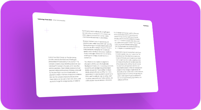 Technology Vision 2023 | When Atoms meet Bits #TechVision fuel things like electric vehicles. By giving the plant to a 12-digit pin and has been used for of昀氀ine and and solar cells a unique digital ID, the company was online purposes like COVID-19 vaccinations and able to expose innovative new business models, contact tracing, as well as banking and 昀椀nancial ones that turned customers into stakeholders. services—and it is now being adopted by Sri Lanka too.58, 59, 60, 61, 62 And the European Union plans to roll 63 Soon enough, However, the time to seize the opportunity and out a digital identity system in 2023. become an early leader is now, and it won’t last long. it won’t just be early adopters creating digital Gaining advantage with single solutions and one-off identities. Businesses may soon be required to do disruptive new efforts today is only part of the story. so to integrate with state-level programs. Enterprise leaders must grasp the full scale and speed at which identity is changing our digital and Digital identity may not be a signi昀椀cant part of your physical landscapes. What we are truly witnessing innovation agenda today—but it needs to be. The is nothing short of digital transformation at a imperative is two-fold: while there is opportunity Look at how Wien Energie, an Austrian energy societal level. to explore, 昀椀nd value, and innovate around digital provider, recently tokenized one of the largest identity right now, there is also a speeding torrent 55 The photovoltaic (PV) solar plants in the country. The UN calls for the creation of a legal ID for of change coming that will inevitably shape what company created unique identifying tokens for each all people by 2030 as part of its Sustainable all businesses can do, and how they do it, across individual PV module in the plant, which were then Development Goals, so it’s no surprise governments the web. Some will experiment with their own sold to customers. Token holders receive an annual around the world are beginning to make digital digital identity projects. Others will investigate and 56 payment relative to the amount of energy produced identity a top priority. As one of the 昀椀rst digital prepare for how changes to digital identity will by the plant. Right now, it’s a closed system, so identity adopters, Estonia has 98% of its citizens demand business transformation. And for everyone, payment is made in the form of discounts on electric registered with its electronic identity system (e-ID) regulations are sure to come, so the last thing you bills. But the company envisions a future where that is used for public services like voting, health want is to be caught off guard and left behind. 57 India’s Aadhaar, with these tokens can be used to fund new plants, used insurance, taxes, and more. It’s time to stop overlooking digital identity. Let it as proof of origin for energy sources, or traded to a 93% adoption rate, ties biometric information catalyze your future.