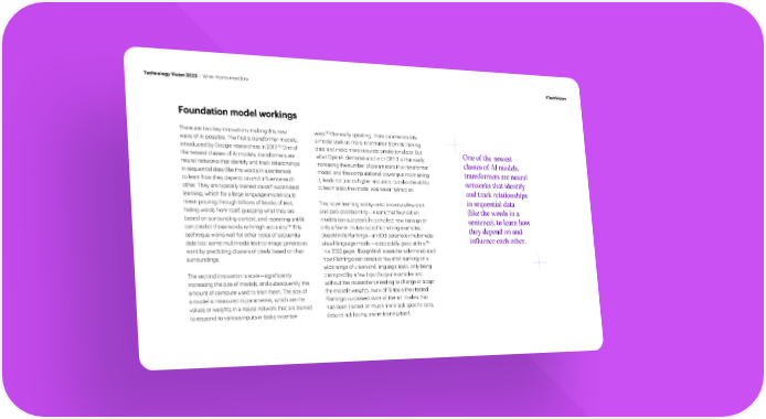 Technology Vision 2023 | When Atoms meet Bits #TechVision Foundation model workings 185 There are two key innovations making this new ways. Generally speaking, more parameters lets wave of AI possible. The 昀椀rst is transformer models, a model soak up more information from its training 183 introduced by Google researchers in 2017. One of data and make more accurate predictions later. But One of the newest the newest classes of AI models, transformers are what OpenAI demonstrated with GPT-3 is that vastly classes of AI models, neural networks that identify and track relationships increasing the number of parameters in a transformer in sequential data (like the words in a sentence), model, and the computational power put into training transformers are neural to learn how they depend on and in昀氀uence each it, leads not just to higher accuracy but also the ability networks that identi¡ other. They are typically trained via self-supervised to learn tasks the model was never trained on. and track relationships learning, which for a large language model could in sequential data mean pouring through billions of blocks of text, This novel learning ability—also known as few-shot hiding words from itself, guessing what they are and zero-shot learning—means that foundation (like the words in a based on surrounding context, and repeating until it models can successfully complete new tasks given sentence), to learn how 184 can predict those words with high accuracy. This only a few or no task-speci昀椀c training examples. they depend on and technique works well for other types of sequential DeepMind’s Flamingo—an 80B parameter multimodal data too: some multimodal text-to-image generators 186 in–uence each other. visual-language model—is especially good at this. work by predicting clusters of pixels based on their In a 2022 paper, DeepMind researchers demonstrated surroundings. how Flamingo can conduct few-shot learning on a wide range of vision and language tasks, only being prompted by a few input/output examples and The second innovation is scale—signi昀椀cantly increasing the size of models, and subsequently, the without the researchers needing to change or adapt amount of compute used to train them. The size of the model’s weights. In six of 16 tasks they tested, a model is measured in parameters, which are the Flamingo surpassed state-of-the-art models that values or weights in a neural network that are trained had been trained on much more task-speci昀椀c data, to respond to various inputs or tasks in certain despite not having any re-training itself.