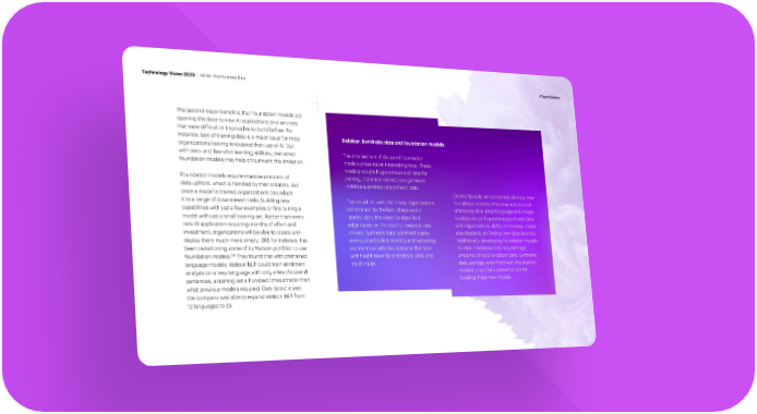 Technology Vision 2023 | When Atoms meet Bits #T#TechVechVisionision The second major bene昀椀t is that foundation models are opening the door to new AI applications and services that were dif昀椀cult or impossible to build before. For instance, lack of training data is a major issue for most Sidebar: Synthetic data and foundation models organizations looking to expand their use of AI. But with zero- and few-shot learning abilities, pretrained The intersection of data and foundation foundation models may help circumvent this limitation. models presents an interesting irony. These models require huge amounts of data for Foundation models require massive amounts of training, but once trained, can generate data upfront, which is handled by their creators. But limitless quantities of synthetic data. once a model is trained, organizations can adapt On the 昀氀ip side, as companies develop new it to a range of downstream tasks, building new This could be useful for many organizations foundation models, they may also run out constrained by the lack of real-world capabilities with just a few examples or 昀椀ne-tuning a of training data. Most language and image model with just a small training set. Rather than every labeled data, the need for data from models rely on huge amounts of web data, new AI application requiring months of effort and edge cases, or the need to preserve data and organizations’ ability to increase model investment, organizations will be able to create and privacy. Synthetic data is primed to play size depends on 昀椀nding new data sources. deploy them much more simply. IBM, for instance, has an important role in training and validating Additionally, developing foundation models been transitioning some of its Watson portfolio to use autonomous vehicles, systems that work for new modalities may require huge 205 They found that with pretrained foundation models. with health records or 昀椀nancial data, and amounts of hard-to-obtain data. Synthetic language models, Watson NLP could train sentiment much more. data, perhaps even from early foundation analysis on a new language with only a few thousand models, could be a powerful tool for sentences, a training set a hundred times smaller than building these new models. what previous models required. Over about a year, the company was able to expand Watson NLP from 12 languages to 25.