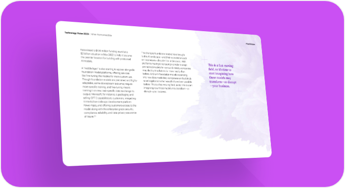 Technology Vision 2023 | When Atoms meet Bits #T#TechVechVisionision Face closed a $100 million funding round at a The changes foundation models have brought $2 billion valuation in May 2022 to help it become to the AI landscape—and their expected impact the premier location for building with pretrained on businesses—shouldn’t be understated. With is is a fast-moving AI models. platforms making it increasingly simple to adapt pre-trained models for various AI needs, companies ‹eld, so it’s time to A “middle layer” is also starting to appear alongside may deploy AI solutions far more readily than start imagining how foundation model platforms, offering services before. And with foundation models expanding these models may like 昀椀ne-tuning the models for more custom use. into new data modalities, companies can build truly transform—or disrupt Though foundation models are pretrained and highly novel applications that wouldn’t have been possible adaptable, some downstream tasks may require before. This is a fast-moving 昀椀eld, so it’s time to start —your business. more speci昀椀c training, and 昀椀ne-tuning means imagining how these models may transform—or training it on new, task-speci昀椀c data to change its disrupt—your business. output. Microsoft, for instance, is packaging and selling GPT-3 capabilities to customers, integrating it into its low-code app development platform Power Apps, and offering customers access to the model along with the enterprise-grade security, compliance, reliability, and data privacy assurance of Azure.215