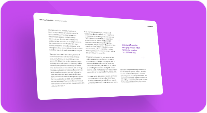 Technology Vision 2023 | When Atoms meet Bits #TechVision down approach that installs a virtual layer on Data mesh is another emerging concept which top of an organization’s various data sources for tackles the problem in a different way. If data fabrics tightly controlled, uni昀椀ed, data management. try to assert top-down management over data, data Metaphorically speaking, it is like building a mesh treats each data source as an independent zoo around your data. You aren’t changing the product. Coined by Zhamak Dehghani in 2019, underlying data, and in fact you’re trying to preserve data mesh stresses domain-speci昀椀c expertise, 145 Data mesh is another the environments—but at the same time you’re management, and governance. The owners of data building consistency across the enclosures, better sources are distributed and entrusted to manage emerging concept which descriptions about what’s inside, and a map to where data themselves, with the expectation that they tackles the problem everything is so it’s all readily accessible by everyone. are trying to reduce the friction to access that data in a di†erent way. (typically through the use of APIs). The major boon here is how the single source of truth and automation can dramatically increase This is particularly useful for businesses that have productivity. One survey found data scientists varied data needs across different environments. spend 45% of their time on data preparation tasks, For instance, an oil and gas company may seek to 143 including data loading and data cleansing. While understand offshore extraction data at one site, these steps may be time-consuming and tedious, then pipeline ef昀椀ciency data at another. So, instead they are necessary to ensure data quality for things of something like a data lake pooling information like data visualization or model development. A data together, a data mesh paradigm can help a company a solid data management strategy is necessary in fabric paradigm can automate data tasks, saving access data across locations from multiple sources. this new era of transparency. That said, the ability the enterprise and its employees’ valuable time, to unlock “windows of transparency” is not the thanks to an active metadata management system. No matter which data strategy you end up with (and same thing as actually opening them. Indeed, many Gartner predicts that by 2025, “active metadata- it can even be both), data mesh and data fabric, businesses will choose to keep their insights under assisted automated functions in the data fabric will as well as the technologies behind them, can help lock-and-key—but as exempli昀椀ed by Yelp, they may reduce human effort by a third, while improving data your enterprise manage its data better—and having 昀椀nd their data out in the open anyway, and soon. 144 utilization fourfold.”