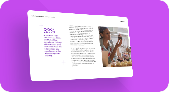Technology Vision 2023 | When Atoms meet Bits #TechVision waste heavy sites for fuel—this would make their raw material sources abundant and no longer potentially vulnerable to global supply chain issues. In addition, because these facilities produce unique materials, 83% a product like vanilla no longer has to come almost entirely from Madagascar but can be made of executives believe synthetically anywhere in the world. Finally, relatively science tech capabilities small-scale manufacturing of things like synthetic could help address protein sources is economically viable (no need societal grand challenges for years of animal farming)—meaning that again, demands on global supply chains are reduced, as of health-related issues are transportation emissions.283 and diseases, while 75% Our world faces immense challenges, many of which believe science tech capabilities could also have been dif昀椀cult and painfully slow to address in the past. But this is the ultimate promise of science help address pover / tech—as more companies invest in the technologies inequali . needed to accelerate science, more companies will be able to use those scienti昀椀c developments to create new solutions faster and more effectively than ever before. It won’t happen overnight, but the bene昀椀ts are necessary and worthwhile, and have the potential to be invaluable for the businesses that get involved.